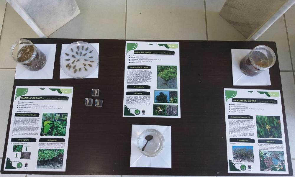 É possível diferenciar os tipos de mangue (árvores típicas do manguezal) pela estrutura reprodutiva; a exposição trouxe exemplares de sementes e propágulos que possibilitam a rápida diferenciação entre o mangue branco, preto, vermelho e de botão, além de informações relevantes desse ecossistema como por exemplo a capacidade de estocar carbono.