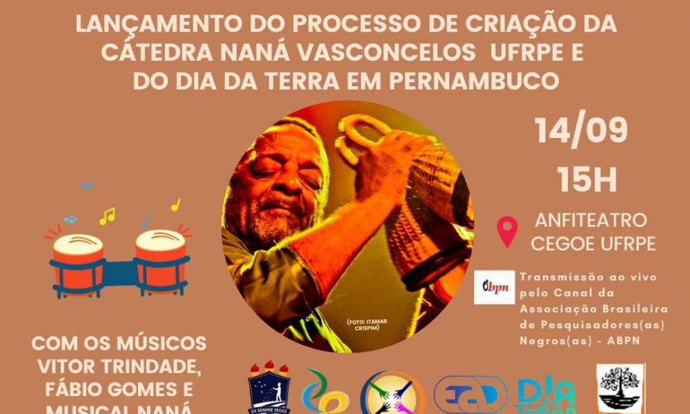 Neste 14/09 às 15h acontecerá o lançamento do Processo de Criação da CÁTEDRA NANÁ VASCONCELOS - UFRPE e do Dia Mundial da Terra em Pernambuco (2023) no Anfiteatro do CEGOE da nossa Ruralinda.