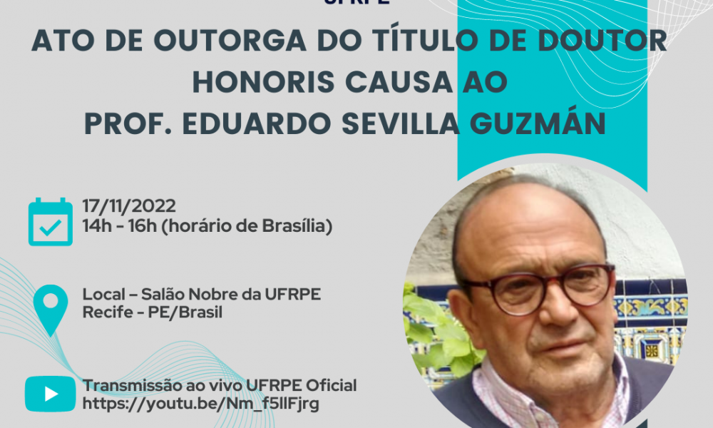 A UFRPE tem a alegria de convidar a tod@s para participar da homenagem de Outorga do Título de Doutor Honoris Causa ao Prof. Catedrático Eduardo Sevilla Guzmán. O referido ATO acontecerá no dia 17.11.2022 e integrará institucionalmente as festividades comemorativas do aniversário de 110 anos da UFRPE e a programação do XX CONEX/PROExC. Realizaremos no âmbito do ATO às 8h o Seminário internacional - Desafios da Agroecologia e Soberania Alimentar em Tempos de Crise Mundial de Alimentos, com participação das seguintes palestrantes convidadas: Emma Siliprandi (FAO/Roma); Nívia Regina da Silva (Brigada do MST/Cuba) e Maria Carmem Cuellar (Mamen) (ISEC/Universidad de Córdoba - Espanha). O evento acontecerá de forma híbrida e garantirá certificado de participação. As inscrições por meio do link que está disponível na bio. Inscrevam-se e participem!