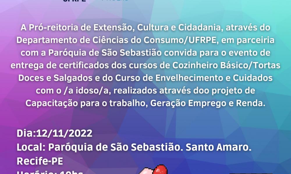 A Pró-Reitoria de Extensão, Cultura e Cidadania, através do Departamento de Ciências do Consumo UFRPE em parceria com a Paróquia de São Sebastião convida para o evento de entrega de certificados dos cursos de Cozinheiro Básico/Tortas Doces e Salgados e do Curso de Envelhecimento e Cuidados com o/a idoso/a, realizados através do projeto de Capacitação para o Trabalho, Geração de Emprego e Renda.