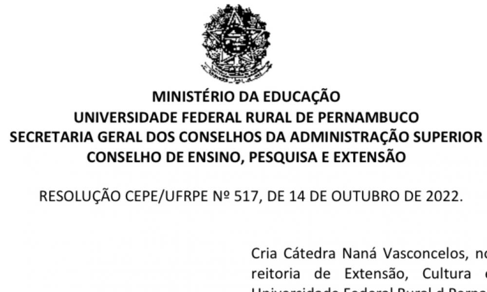 O Presidente em Exercício do Conselho de Ensino, Pesquisa e Extensão da Universidade Federal Rural de Pernambuco, no uso de suas atribuições e tendo em vista o disposto no Parágrafo 6º do Artigo 15 do Estatuto desta Universidade e considerando os termos da Decisão Nº 08/2022 da Câmara de Extensão deste Conselho, em sua V Reunião Ordinária, realizada no dia 10 de outubro de 2022, exarada no Processo UFRPE Nº 23082.025310/2022-93, resolve criar, em sua área de competência, no âmbito da Pró-reitoria de Extensão, Cultura e Cidadania da Universidade Federal Rural de Pernambuco, a Cátedra Naná Vasconcelos, conforme anexo e de acordo com o que consta do Processo acima mencionado.