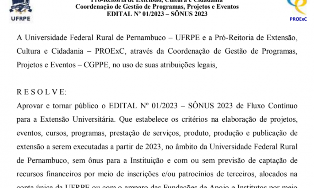 Aprovar e tornar público o EDITAL No 01/2023 – SÔNUS 2023 de Fluxo Contínuo para a Extensão Universitária. Que estabelece os critérios na elaboração de projetos, eventos, cursos, programas, prestação de serviços, produto, produção e publicação de extensão a serem executadas a partir de 2023, no âmbito da Universidade Federal Rural de Pernambuco, sem ônus para a Instituição e com ou sem previsão de captação de recursos financeiros por meio de inscrições e/ou patrocínios de terceiros, alocados na conta única da UFRPE ou com o amparo das Fundações de Apoio e Institutos por meio de Convênios e Contratos.