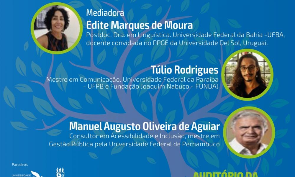 Iniciaremos nossa Semana no auditório da Biblioteca Setorial com a mesa Acessibilidade e Cérebro que contará com Edite Marques de Moura, Túlio Rodrigues e Manuel Augusto Oliveira de Aguiar. A mesa terá início às 11h.