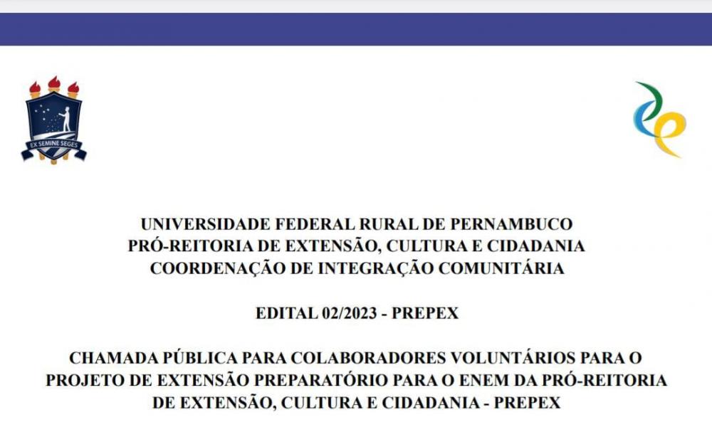EDITAL 02/2023 - PREPEX CHAMADA PÚBLICA PARA COLABORADORES VOLUNTÁRIOS PARA O PROJETO DE EXTENSÃO PREPARATÓRIO PARA O ENEM DA PRÓ-REITORIA DE EXTENSÃO, CULTURA E CIDADANIA - PREPEX Edital Equipe PREPEX 2023.pdf