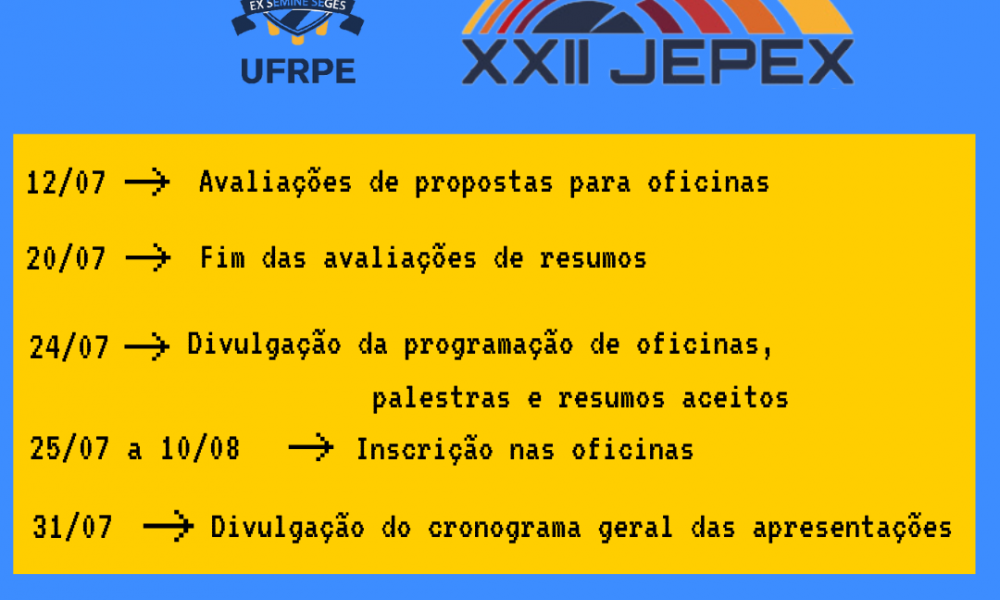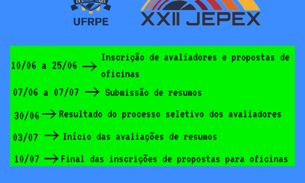 Na XXII JEPEX resumos que não são vinculados à UFRPE também podem ser submetidos. Fiquem atentos ao tipo de trabalho realizado e onde ele melhor se enquadra. Exemplo: projeto de extensão vinculado a outra instituição poderá ser submetido ao XX CONEX, projetos de pesquisa no CIC e assim sucessivamente.