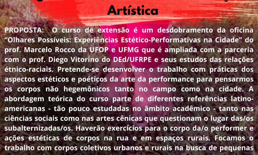PROPOSTA: O curso de extensão é um desdobramento da oficina "Olhares Possíveis: Experiências Estético-Performativas na Cidade" do prof. Marcelo Rocco da UFOP e UFMG que é ampliada com a parceria com o prof. Diego Vitorino do DEd/UFRPE e seus estudos das relações étnico-raciais. Pretende-se desenvolver o trabalho com práticas dos aspectos estéticos e poéticos da arte da performance para pensarmos os corpos não hegemônicos tanto no campo como na cidade. A abordagem teórica do curso parte de diferentes referências latino- americanas - tão pouco estudadas no âmbito acadêmico - tanto nas ciências sociais como nas artes cênicas que questionam o lugar das/os subalternizadas/os. Haverão exercícios para o corpo da/o performer e ações estéticas de corpos na rua e em espaços rurais. Focamos o trabalho com corpos coletivos urbanos e rurais na busca de pequenas criações de camadas estético-poéticas sobre as arquiteturas institucionalizadas para a cidade e o campo.