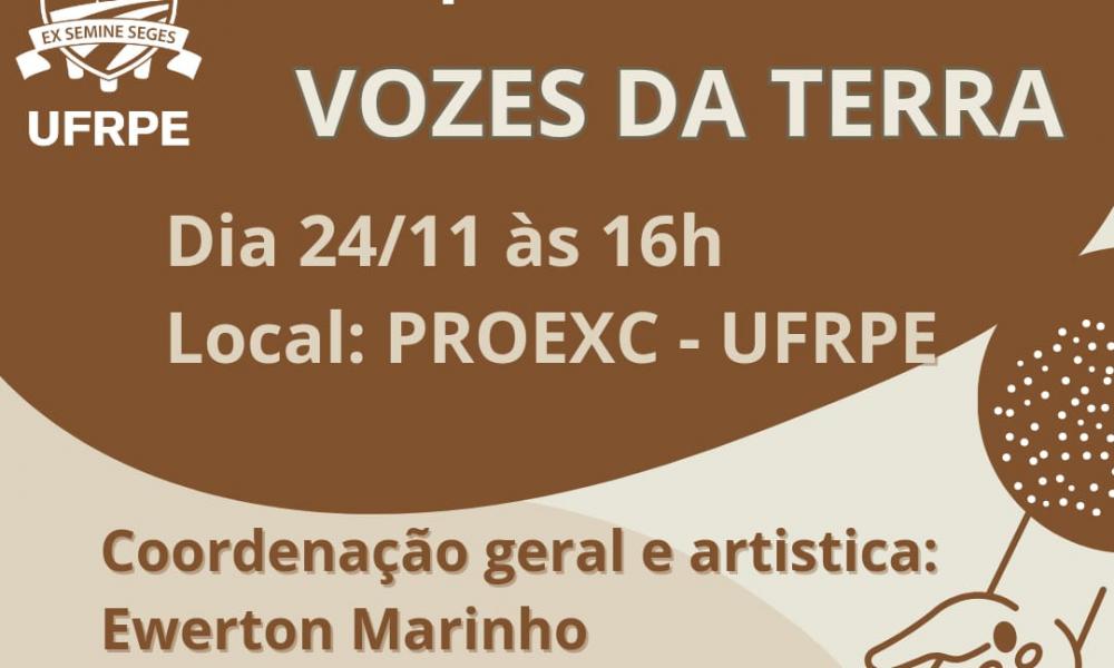 No dia 24 de novembro, na PROExC, o Coro da UFRPE e a Escola de Música Naná Vasconcelos irão apresentar o recital Vozes da Terra. Esperamos todos vocês na sexta-feira para prestigiar esse belíssimo recital!
