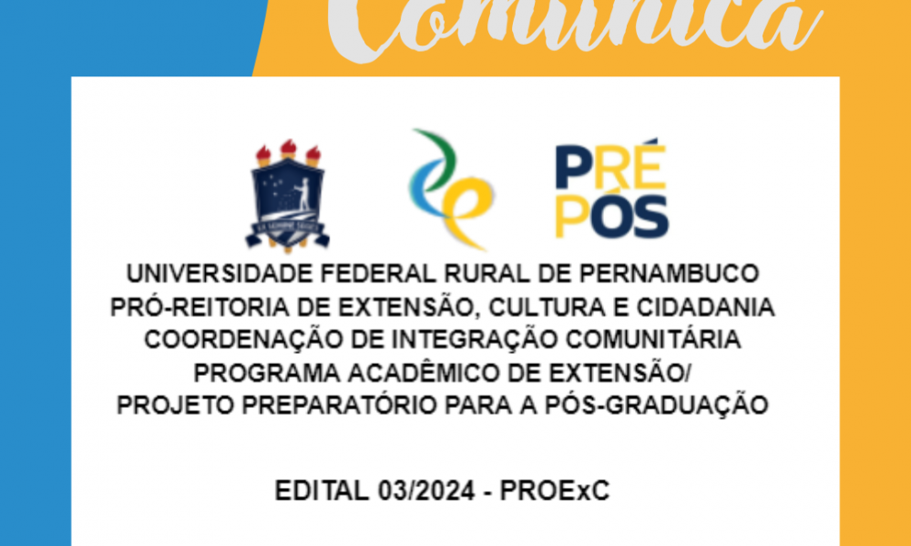 O presente edital tem por objetivo divulgar a abertura das inscrições a todos interessados em cursar o Preparatório para pós-graduação da Pró-Reitoria de Extensão, Cultura e Cidadania da Universidade Federal Rural de Pernambuco (PREPÓS/UFRPE).