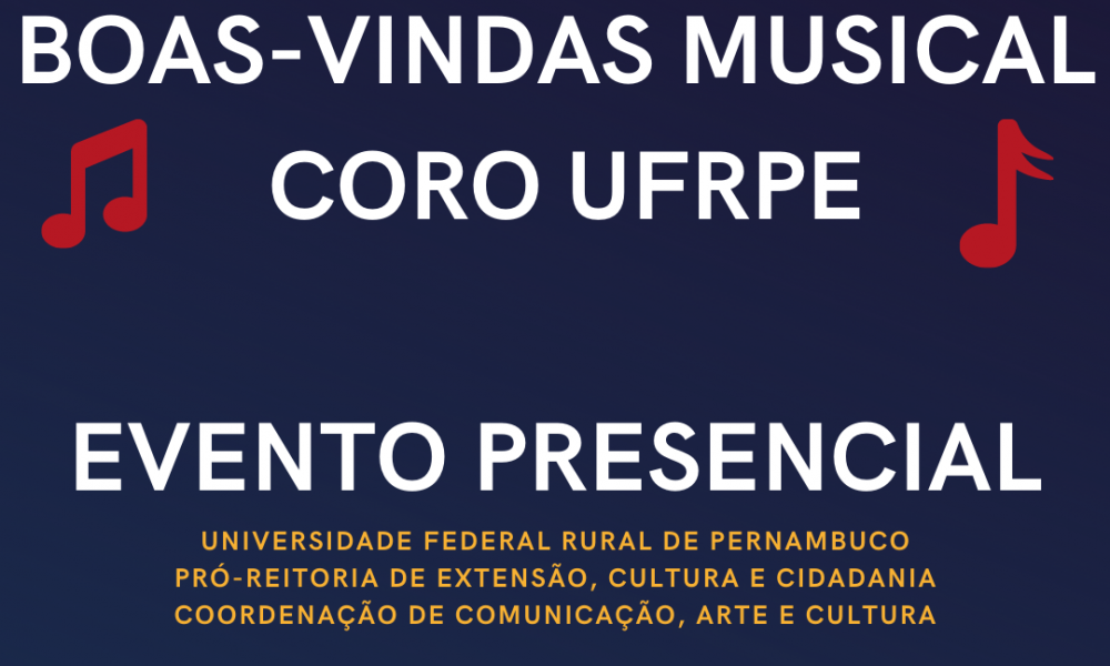 Nesta sexta-feira, 18 de março, às 17 horas acontecerá uma recepção de boas-vindas musical aos servidores/as técnicos e docentes e as/aos discentes da UFRPE, realizada pela Universidade Federal Rural de Pernambuco, Pró-Reitoria de Extensão, Cultura e Cidadania, Coordenação de Comunicação, Arte e Cultura, e pelo Coro UFRPE.