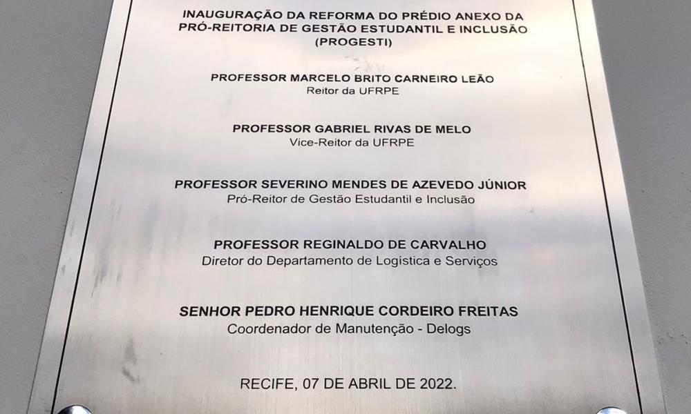 Hoje, 7 de abril, ocorreu na Universidade Federal Rural de Pernambuco a inauguração do prédio anexo da Pró-reitoria de Gestão Estudantil e Inclusão (PROGESTI), com a presença do Reitor, Professor Marcelo Brito Carneiro Leão e Pró-reitor de Gestão Estudantil e Inclusão, Professor Severino Mendes de Azevedo Júnior, Coordenadora de Comunicação, Arte e Cultura, Profª. Fábia Burgos, Diretor do Departamento de Logística e Serviços, Prof. Reginaldo de Carvalho, Coordenadora da Residência Universitária, Camila Lais Lucena, dentre outros Servidores e Estudantes.