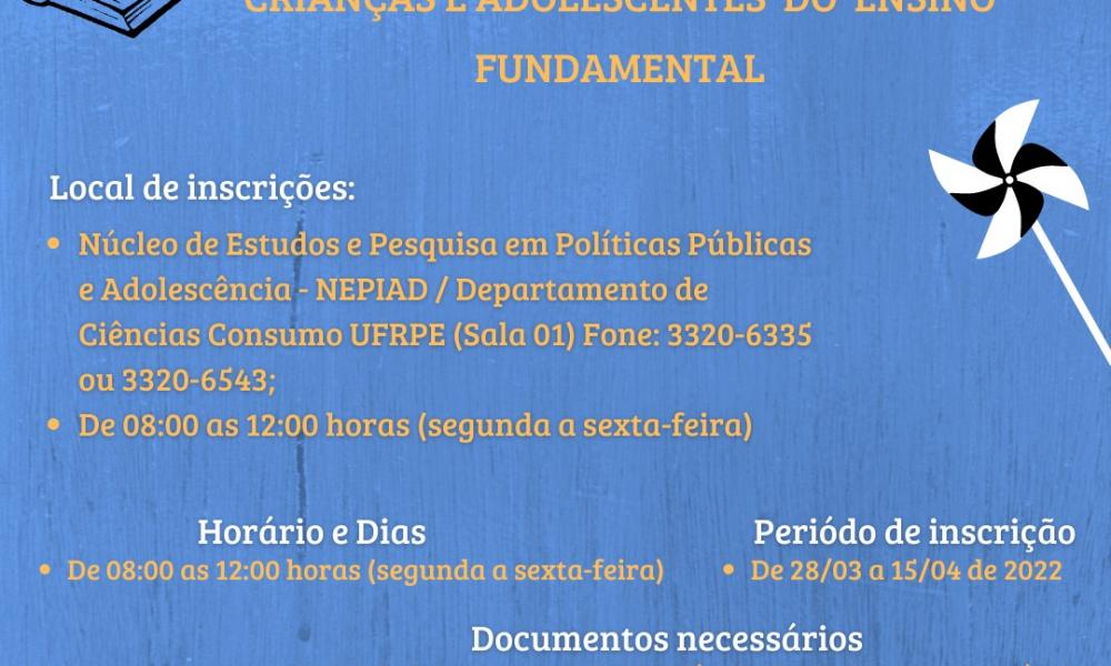 As inscrições serão realizadas no Núcleo de Estudos e Pesquisa em Políticas Públicas e Adolescência - NEPIAD / Departamento de Ciências Consumo UFRPE (Sala 01) das 08:00 as 12:00 horas (segunda a sexta-feira).