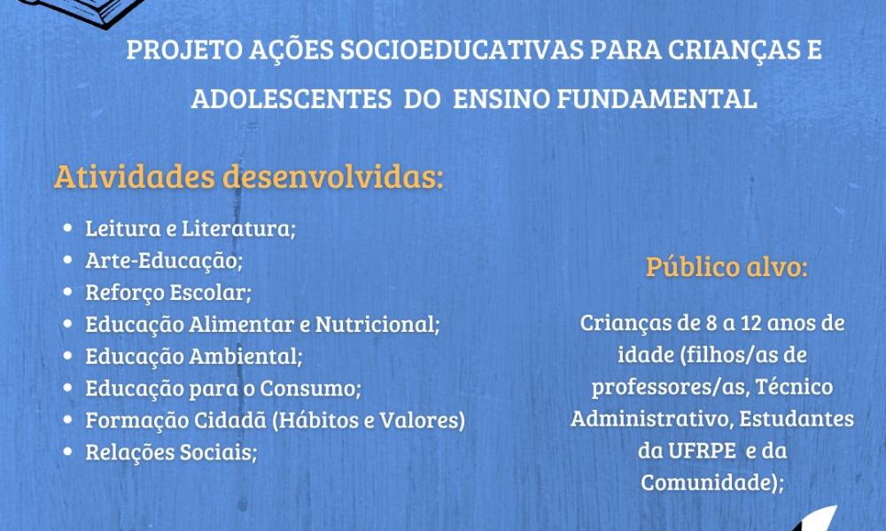 Projeto de Ações Socioeducativas para Crianças e Adolescentes do Ensino Fundamental tem como objetivo proporcionar para Crianças de 8 a 12 anos de idade (filhos/as de professores/as, Técnico Administrativo, Estudantes da UFRPE e da Comunidade) o acesso plural a Leitura e Literatura; Arte-Educação; Reforço Escolar; Educação Alimentar e Nutricional; Educação Ambiental; Educação para o Consumo; Formação Cidadã (Hábitos e Valores); Relações Sociais.