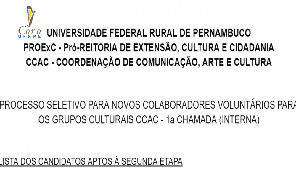 PROCESSO SELETIVO PARA NOVOS COLABORADORES VOLUNTÁRIOS PARA OS GRUPOS CULTURAIS CCAC - 1a CHAMADA (INTERNA)