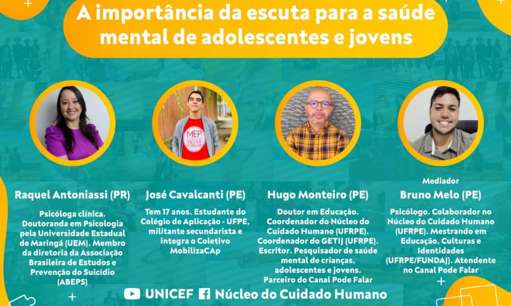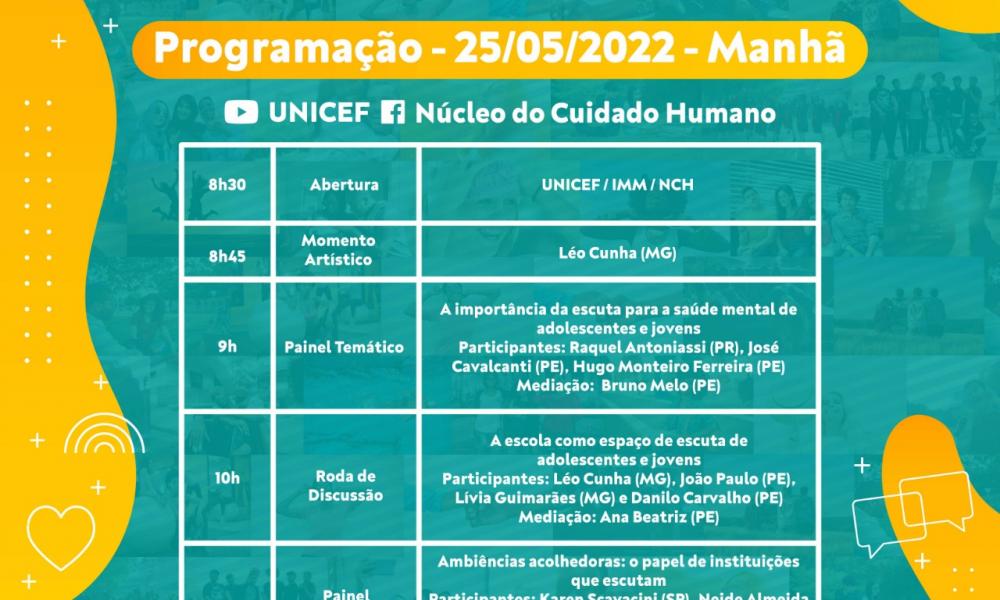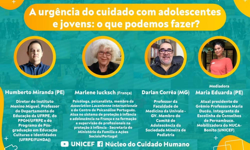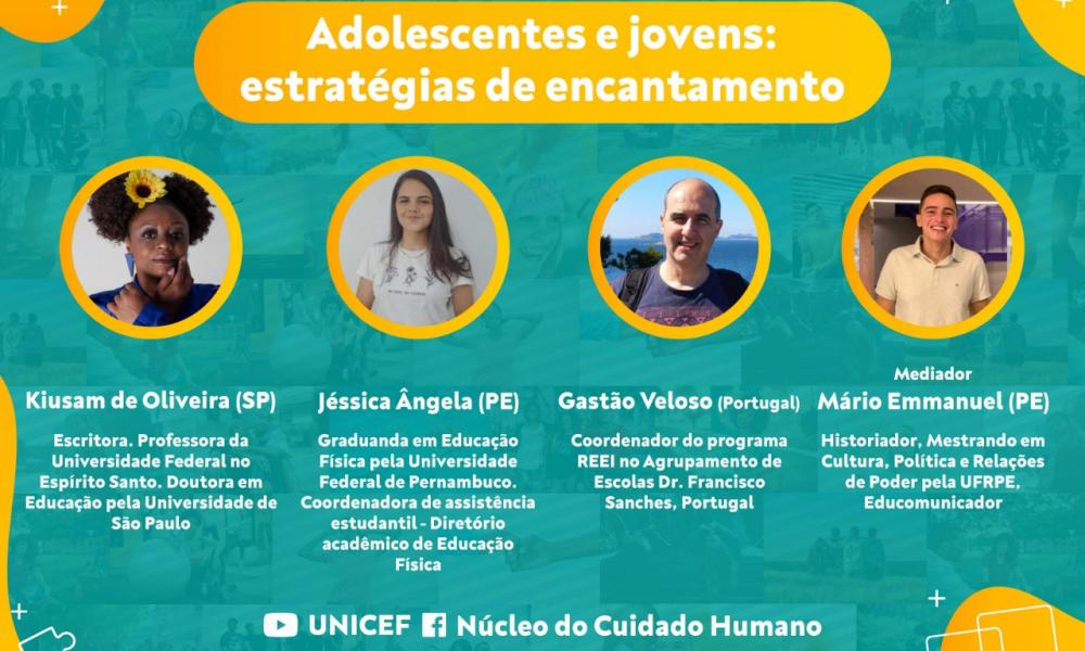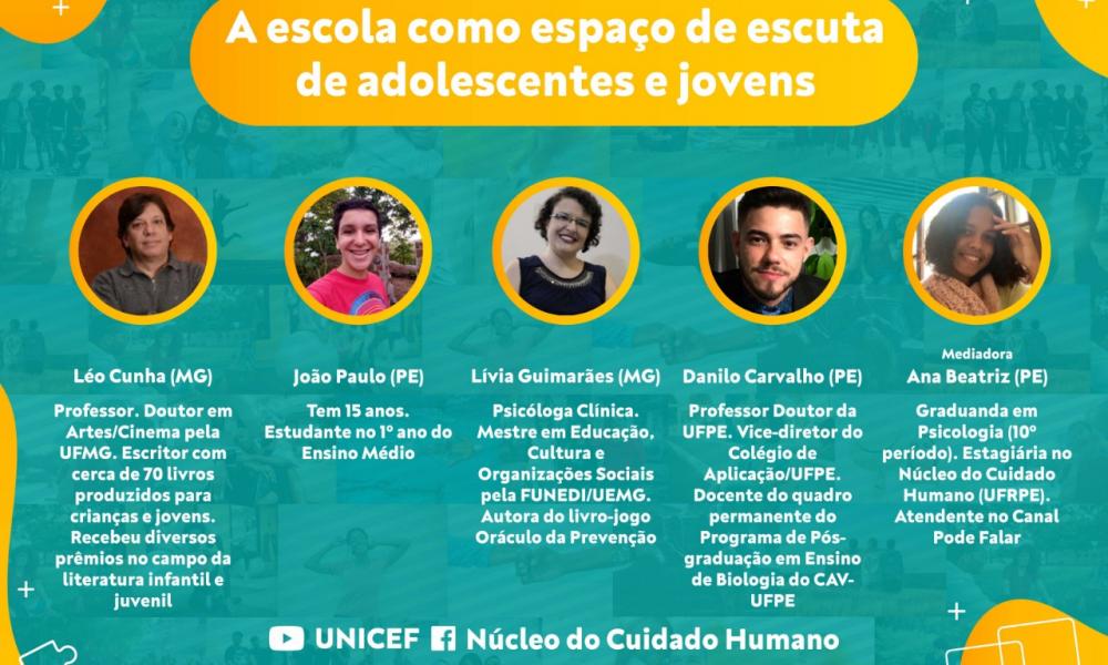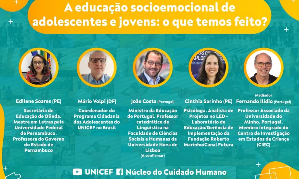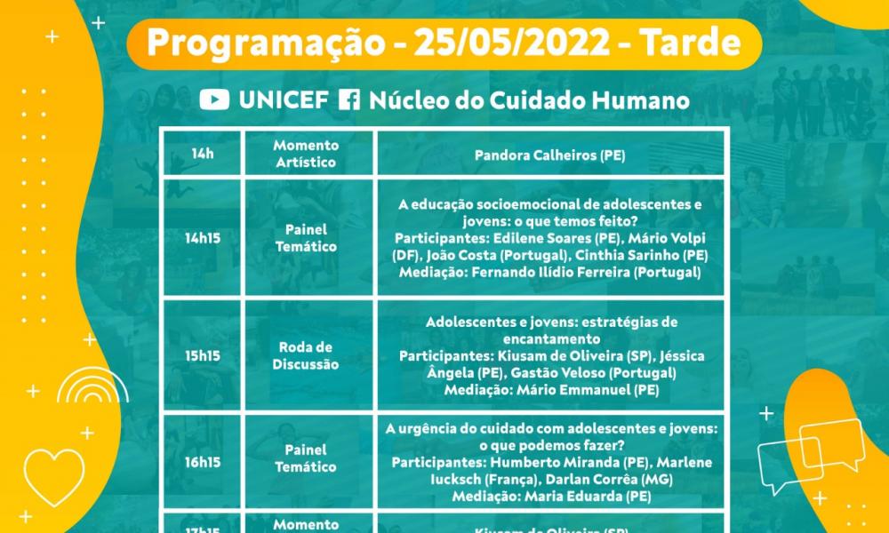 Com transmissão ao vivo pelo canal oficial do UNICEF-Brasil no YouTube e pela página do Facebook do Núcleo do Cuidado Humano/UFRPE, o II Seminário traz participações de adolescentes, jovens e especialistas do Brasil e de Portugal.